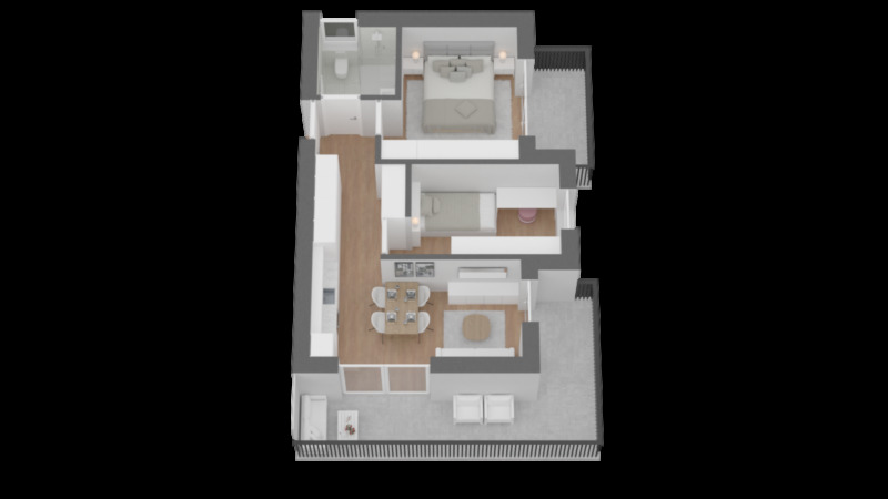 Die Wohnung besteht aus einem offenem Wohn-Essbereich mit integrierter Küche, ein Hauptschlafzimmer sowie ein weiteres Zimmer, das sich ideal als Kinderzimmer, Gästezimmer oder Home-Office eignet, ein modern ausgestattetes Badezimmer und zwei Balkone.