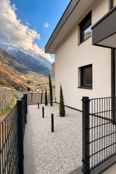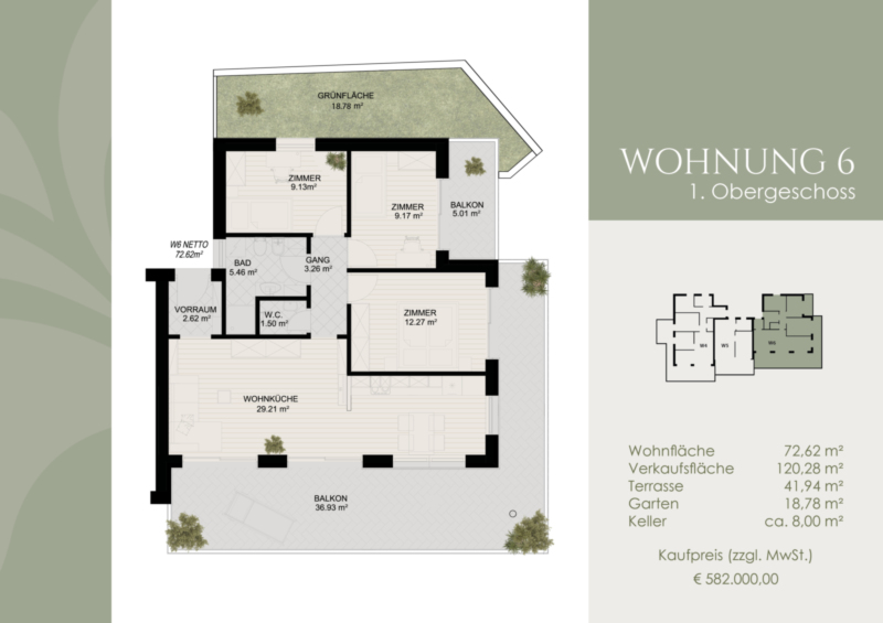 Die Wohnung im ersten Stock bietet eine großzügige Wohnküche, drei Schlafzimmer, zwei Badezimmer und einen einladenden Eingangsbereich. Eine große Terrasse erweitert den Wohnraum nach außen und lädt zum Entspannen ein. Ergänzt wird das Angebot durch einen kleinen Garten mit Nordausrichtung. Durch die südöstliche Ausrichtung und die großzügige Sonneneinstrahlung präsentiert sich die Wohnung hell, freundlich und lichtdurchflutet.