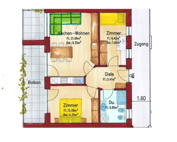 Diese Wohnung im 1. Obergeschoss besteht aus einem Eingangsbereich, einer Wohnküche, zwei Schlafzimmern, einem Bad mit Fenster, und einem schönen Westbalkon. Ein Keller ist im Preis inbegriffen, Garagenstellplätze können gegen Aufpreis erworben werden.
