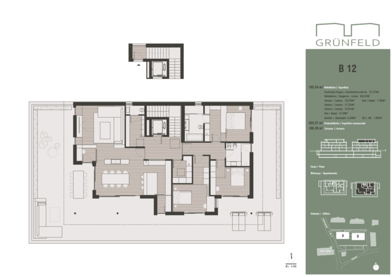 Mit einer großzügigen Wohnfläche bietet dieses Penthouse außergewöhnlichen Komfort und Raum. Der offene Wohn- und Essbereich ist lichtdurchflutet und ermöglicht einen weiten Blick in die Natur. Bodentiefe Fenster verbinden den Innenbereich mit der 187m² großen Dachterrasse und lassen die Schönheit der Berge in jedes Zimmer strömen. Vier Schlafzimmer bieten Platz für Ruhe und Erholung. Ebenso gehören drei Bäder und ein Hauswirtschaftsraum zur Wohnung. Mit dem Aufzug des Gebäudes gelangt man direkt und bequem in den offenen Eingangsbereich, welcher viel Stauraum bietet. Im 2. Untergeschoss befindet sich ein Keller und es können mehrere Garagenboxen dazugekauft werden.