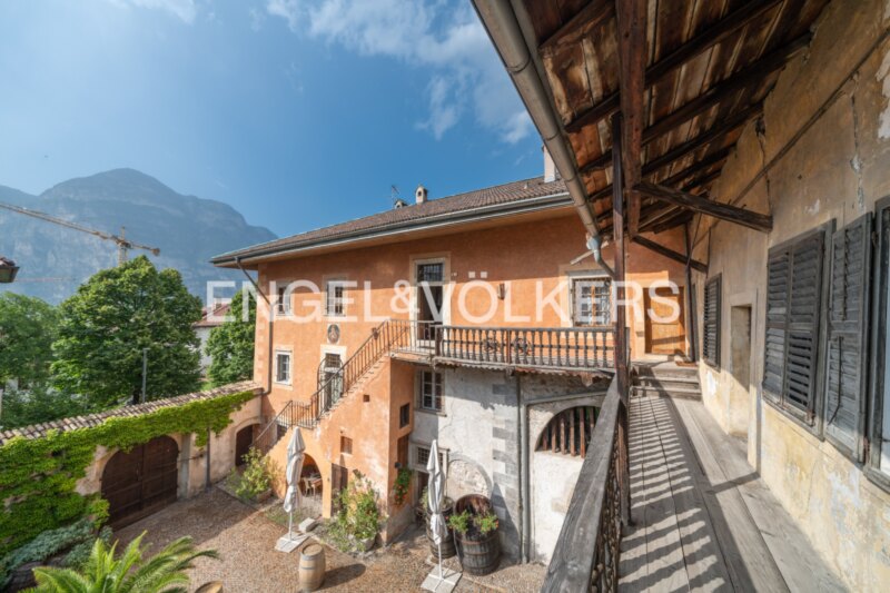 Zum Verkauf steht der größte Teil eines denkmalgeschützten historischen Wohnhauses mit großem privaten Innenhof, das teilweise sorgfältig renoviert wurde und reich an authentischer historischer Substanz ist. Das Herzstück des Anwesens ist der imposante Eingangssaal mit venezianischem Terrazzoboden und raffinierten Stuckarbeiten an der Decke, der den meisterhaft restaurierten historischen Teil vom rechten Flügel trennt, welcher komplett im Stil des historischen Gebäudes renoviert wurde. Die große, nach Südwesten ausgerichtete Stube besticht durch ihre restaurierten Täfelungen, antiken Holztüren und einen bedeutenden originalen Kachelofen aus Sfruz aus dem frühen 19. Jahrhundert, den wir auch im großen Salon am Eingang der Wohnung wiederfinden. Angrenzend befindet sich ein reizender kleiner Erker im gleichen Stil. Der Weg führt harmonisch weiter zu einer gemütlichen, kleineren Stube mit einem weiteren wertvollen Ofen aus Sfruz und anschließend in das getäfelte Esszimmer. Der rechte Flügel verbindet historischen Stil mit modernem Wohnkomfort: Zwei Schlafzimmer, eines davon mit begehbarem Kleiderschrank, eine moderne Wohnküche mit Essbereich und Zugang zum Balkon sowie ein großes Badezimmer mit Badewanne und Dusche schaffen ein komfortables Wohnambiente. Ein weiterer, sehr großer Raum steht zur individuellen Nutzung bereit und lässt sich mit geringem Aufwand in ein zusätzliches Schlafzimmer mit Bad en suite umgestalten. Das Anwesen verfügt außerdem über einen großen Dachboden mit Blick auf das Etschtal, für den vom Amt für Kulturgüter ein Projekt genehmigt wurde, das den Bau von zwei oder mehr Wohnungen und die Renovierung weiterer Räume vorsieht. Ein historischer Laubengang, der derzeit zusammen mit einem großen Saal im Erdgeschoss vermietet ist, spendet in den Sommermonaten wertvollen Schatten. Das Immobilienangebot umfasst zwei überdachte Parkplätze in einem Laubengang mit separatem Eingang, während sich ein öffentlicher Parkplatz nur wenige Schritte vom Anwesen entfernt befindet.
