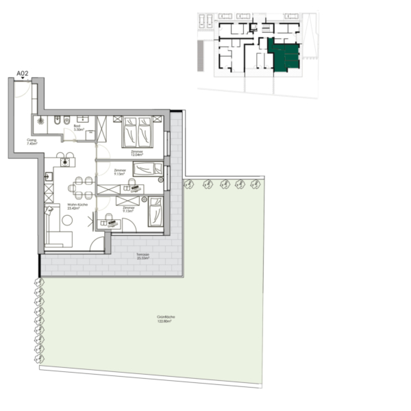Konventionierte Vierzimmerwohnung mit Wohnküche, drei Shlafzimmern, Bad, Terrasse, Garten und Keller.