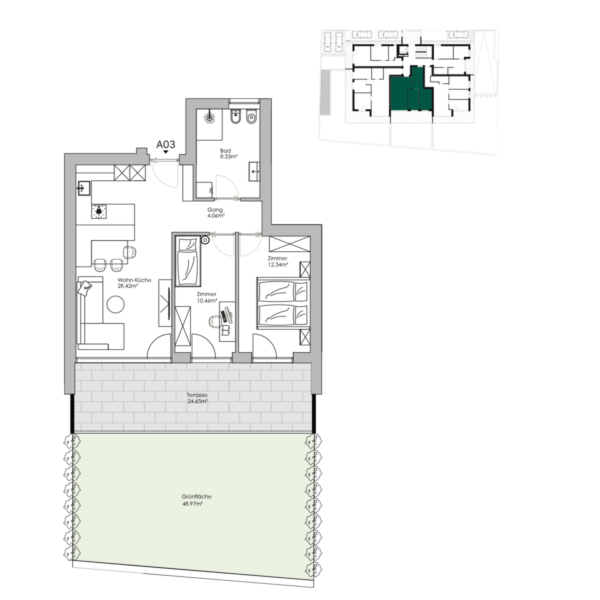 Konventionierte Dreizimmerwohnung mit Wohnküche, zwei Schlafzimmern, Bad, Terrasse, Garten und Keller.
