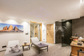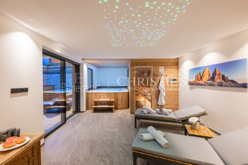 Im Erdgeschoss befindet sich ein stilvoller privater Wellnessbereich, ideal zum Entspannen nach einem Tag an der frischen Bergluft. Die Spa-Anlage verfügt über einen Whirlpool, eine Sauna sowie einen komfortablen Ruhebereich und wird durch ein separates Badezimmer ergänzt, das dem Wellnessbereich dient. Von dieser Ebene aus gelangt man zudem auf eine kleine Außenterrasse, die sich perfekt eignet, um die frische Luft der Dolomiten zu genießen und die Ruhe der alpinen Landschaft auf sich wirken zu lassen.