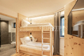 Im ersten Obergeschoss befindet sich der Schlafbereich mit drei hellen und einladenden Doppelzimmern. Das Hauptschlafzimmer ist mit einem Zimmer mit Etagenbett verbunden und verfügt über ein Bad en suite, eine besonders praktische Lösung auch für Familien. Die beiden weiteren Doppelzimmer teilen sich ein Badezimmer, das von beiden Zimmern aus bequem erreichbar ist. Zwei der Schlafzimmer verfügen zudem über großzügige private Terrassen, von denen aus sich ein herrlicher Blick auf die umliegende Berglandschaft genießen lässt.