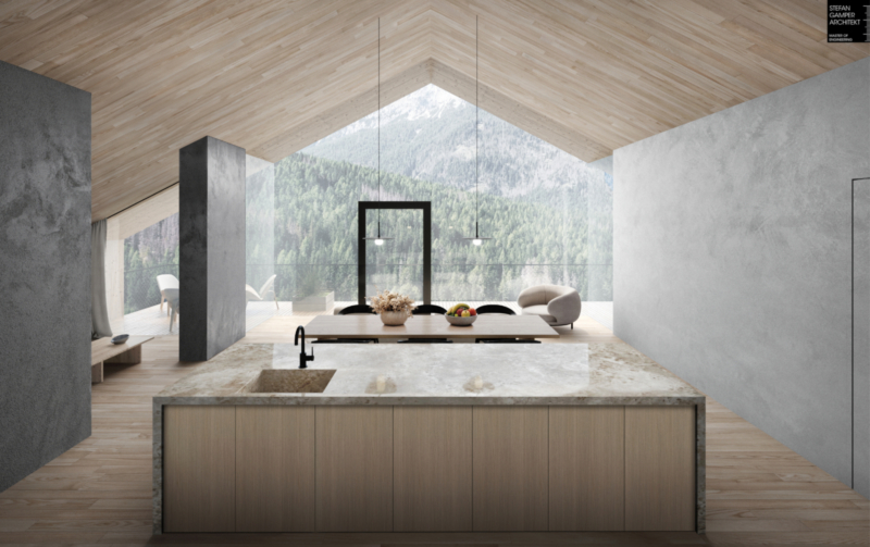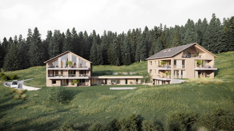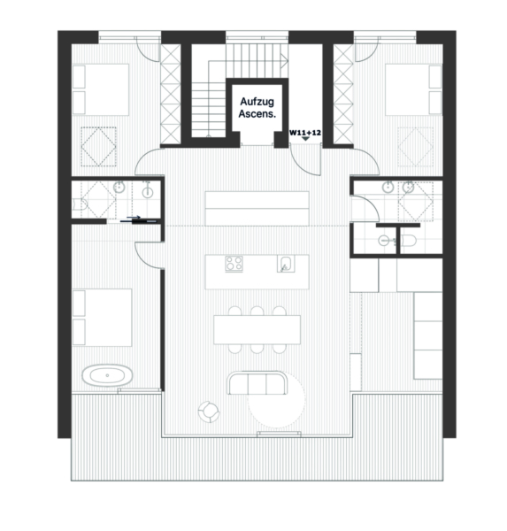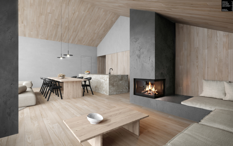 Die Wohnung im zweiten Obergeschoss umfasst eine helle Wohnküche mit atemberaubender, deckenhoher Fensterfront und gemütlichem Ofen, drei geräumige Schlafzimmer ein Badezimmer und ein WC. Eine nach Süden ausgerichtete Terrasse rundet das Angebot ab. Der direkte Zugang zur Wohnung per Aufzug verleiht der Wohnung das besondere Penthouse-Feeling.