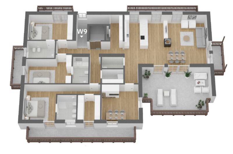 Die durchdacht gestaltete Wohnung besticht durch einen einladenden Eingangsbereich, eine offen gestaltete Wohnküche mit angrenzender Stube, drei Schlafzimmer – jeweils mit eigenem Badezimmer – sowie ein separates Tages-WC und einen praktischen Waschraum.