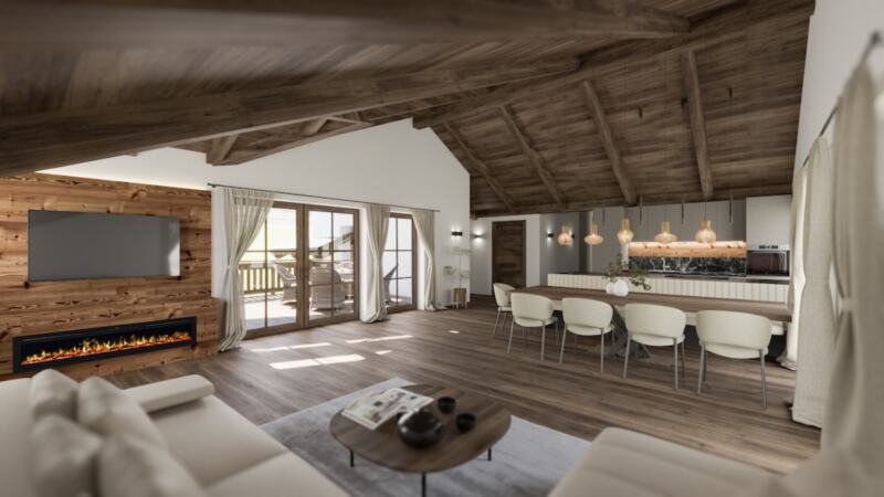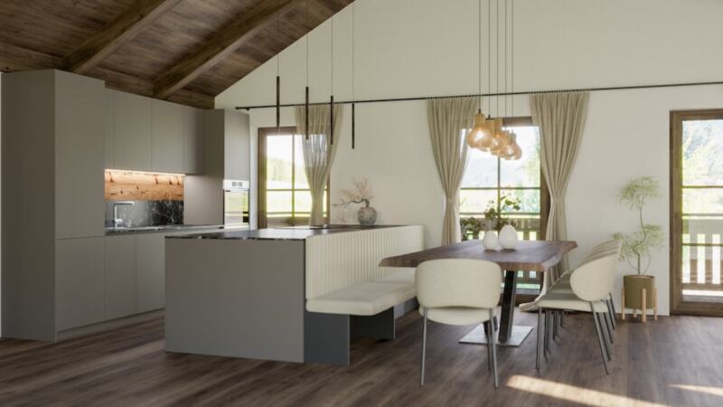 Der lichtdurchflutete Wohn- und Essbereich mit integrierter Küche schafft eine angenehme Atmosphäre für geselliges Beisammensein. Die großzügige Loggia sowie ein Balkon eröffnen einen atemberaubenden Blick auf die umliegende Bergwelt – ideal, um die Ruhe und Schönheit der Natur zu genießen.