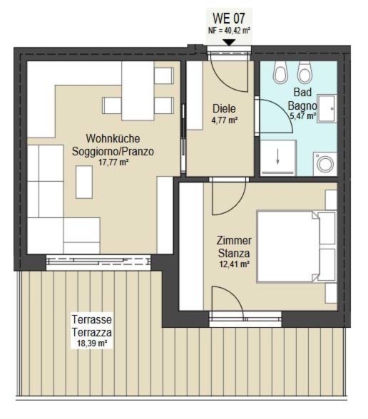 2-Zimmerwohnung im Neubau "Residence Maurerhäusl" in Vintl bestehend aus einem Wohnzimmer mit Küche, einem Schlafzimmer, einem Badezimmer mit Dusche sowie einer großen Terrasse mit südlicher Ausrichtung. Der Keller befindet sich im Untergeschoss.