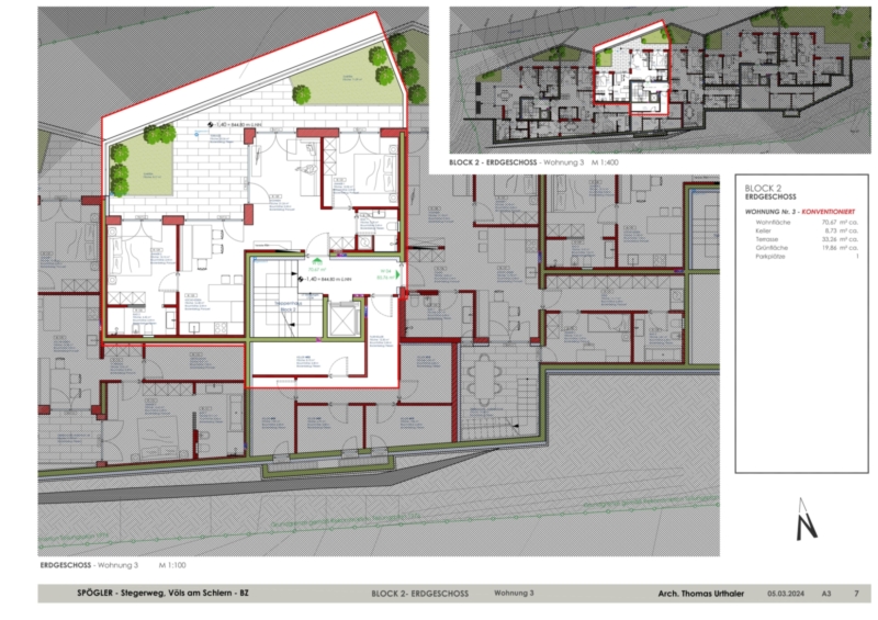 Die konventionierte Wohneinheit befindet sich im Erdgeschoss des Mehrfamilienhauses und verfügt über einen offenen Wohn-Essbereich, zwei Hauptschlafzimmer und zwei Badezimmer. Die Wohneinheit Nr. 3 verfügt außerdem über einen privaten Garten und eine Terrasse. Die großflächigen Glaselemente sorgen außerdem für lichtdurchflutete Räumlichkeiten und höchsten Wohnkomfort.