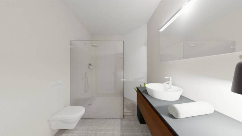 Ergänzt wird das elegante Interieur durch ein modernes Badezimmer mit Dusche und Großformatfliesen sowie ein separates Gäste-WC ideal für zusätzlichen Komfort im Alltag