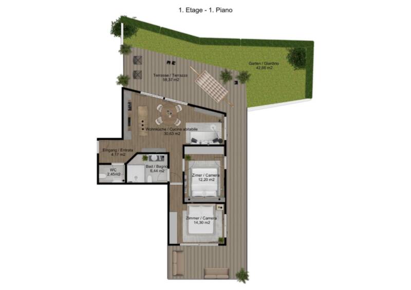 Ein besonderes Highlight ist der private Garten, der zusätzlichen Raum zum Verweilen bietet und Ihre Verbindung zur Natur unterstreicht ideal für entspannte Sommertage.