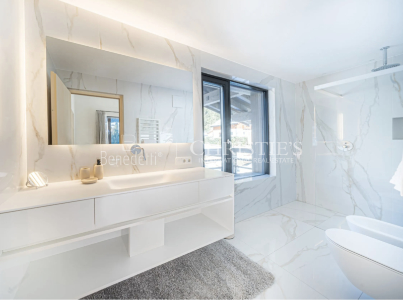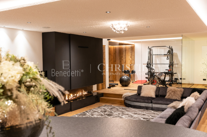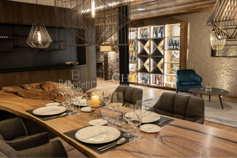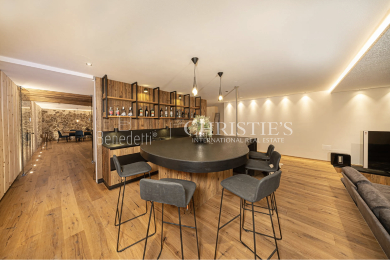 Die gemeinschaftlichen Wohnbereiche sind großzügig und lichtdurchflutet und umfassen eine voll ausgestattete Küche, einen eleganten Essbereich sowie ein stilvolles Wohnzimmer mit privater Bar und Billardtisch, ideal für gesellige Stunden nach einem Tag auf den Skipisten oder den Bergwanderwegen. In den oberen Etagen befinden sich zudem zwei weitere Wohnbereiche mit dezent integrierten, verborgenen Küchenzeilen, die den Gästen zusätzliche Unabhängigkeit und Komfort bieten.