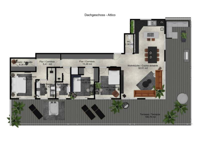 Questo elegante attico si distingue per il comfort abitativo moderno e un'ampia terrazza accessibile da tutte le stanze. La terrazza offre ampio spazio per godersi l'aria fresca e l'ambiente esterno.
