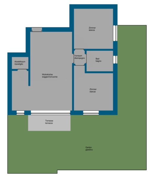 L'appartamento dispone di due ampie camere matrimoniali che offrono molteplici possibilità di utilizzo, sia come camera da letto dei genitori, camera dei bambini o anche come zona combinata di lavoro e zona notte. La zona giorno ben strutturata si apre verso il giardino e crea transizioni fluide tra lo spazio interno ed esterno. Il giardino privato offre molto spazio per giocare, rilassarsi o trascorrere ore piacevoli all'aperto.