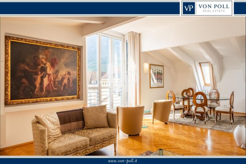 Nel cuore più autentico di Bolzano, affacciato direttamente su piazza Walther, questo attico su due livelli unisce eleganza senza tempo e una posizione davvero impareggiabile.