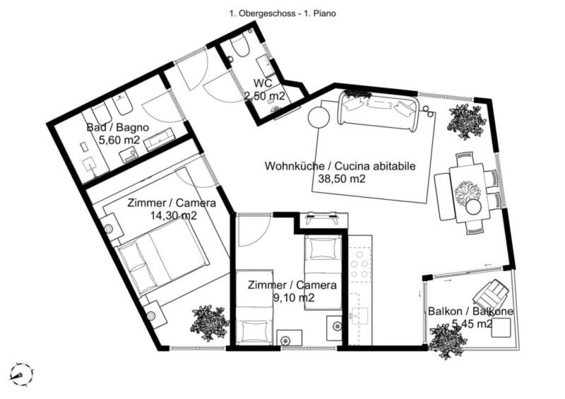 Questo elegante appartamento trilocale al primo piano offre una distribuzione degli spazi ben studiata e un elevato comfort abitativo in una posizione esclusiva tra i vigneti di Gries. La zona giorno con cucina a vista si apre sul balcone, ideale per rilassarsi allaria aperta. Due camere da letto e due bagni raffinati con doccia creano unatmosfera armoniosa e accogliente.