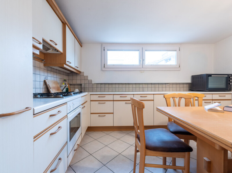 Cucina luminosa, ripostiglio, bagno con finestra, stanza versatile, ampia terrazza esposta a sud – ideale per godere il sole e momenti di relax.