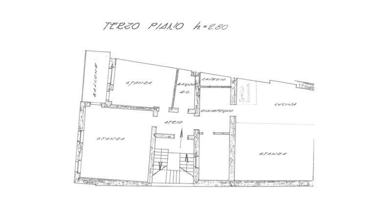 L'appartamento dispone di ingresso, cucina abitabile con dispensa, salotto molto spazioso, 2 stanze, ripostiglio, balcone, bagno-Wc, cantina nel piano cantine.