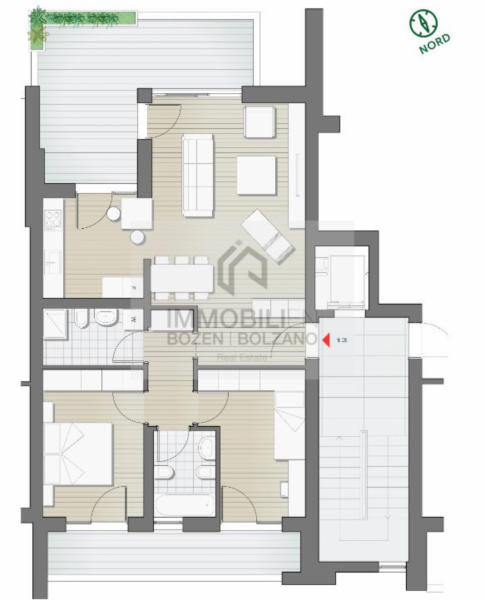 A Firmiano è in vendita questo esclusivo trilocale di nuova costruzione con classe energetica A. L’immobile è situato al 6° piano di un moderno edificio residenziale e si distingue per l’esposizione nord-sud, che garantisce ambienti luminosi e un elevato comfort abitativo. L’appartamento ha una superficie commerciale di circa 112 mq e presenta una distribuzione degli spazi ben studiata. L’ingresso conduce alla zona giorno con angolo cottura, dalla quale si accede direttamente alla terrazza. Un corridoio conduce alla zona notte, composta da due camere da letto e due bagni. Dalle camere da letto si accede a un balcone. Una cantina è inclusa nel prezzo di vendita. Box garage di diverse dimensioni sono disponibili separatamente. L’appartamento è convenzionato, c’è la possibilità di togliere il vincolo. Tutte le informazioni sono riportate indicativamente e possono essere soggette a modifica.