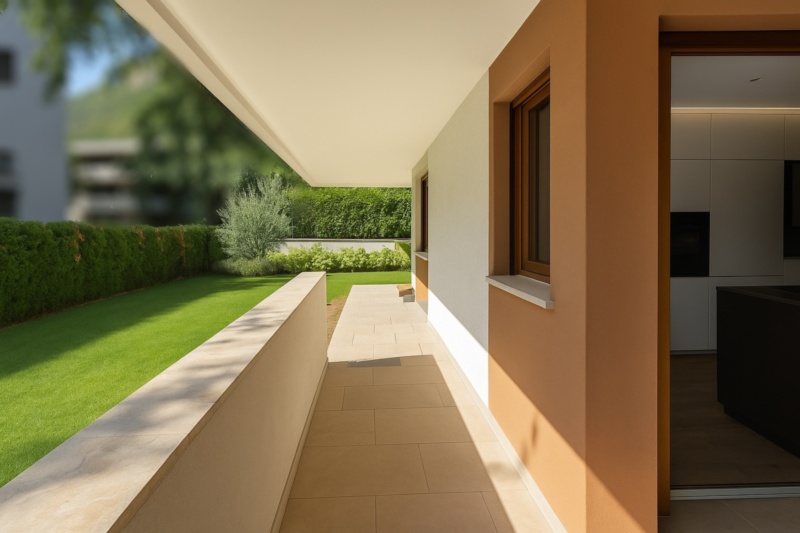Particolarmente pregiato è lo spazio esterno: una terrazza coperta e un giardino curato di circa 100 m² ampliano lo spazio abitativo verso l’esterno – perfetti per rilassarsi, godersi momenti conviviali e vivere la natura in piena privacy.