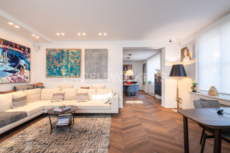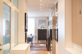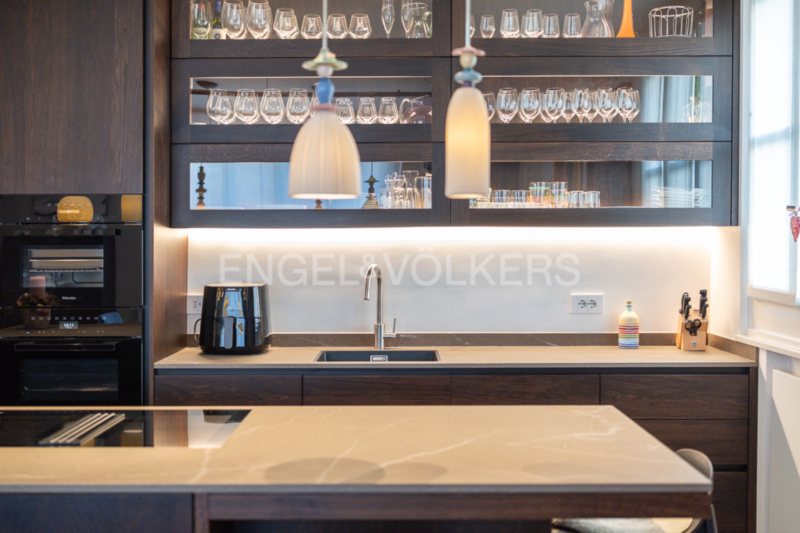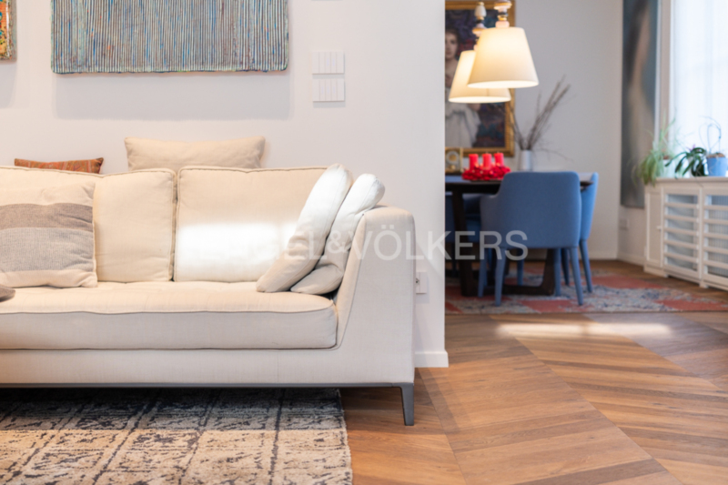La zona giorno open space, composta da soggiorno e sala da pranzo, colpisce per la sua straordinaria ampiezza, ulteriormente valorizzata – come in tutto l’appartamento – da un’imponente altezza interna di tre metri. La cucina su misura, con moderna isola centrale, elettrodomestici da incasso Miele di alta qualità e cantinetta vini integrata, rappresenta il fulcro elegante della vita quotidiana. Il soggiorno, particolarmente luminoso grazie alle numerose finestre, offre accesso a un balcone. Tutti gli infissi sono stati smontati e restaurati con cura artigianale tradizionale nel corso della ristrutturazione, preservando così il carattere storico dell’edificio e integrandosi al contempo in modo armonioso con l’arredo moderno.