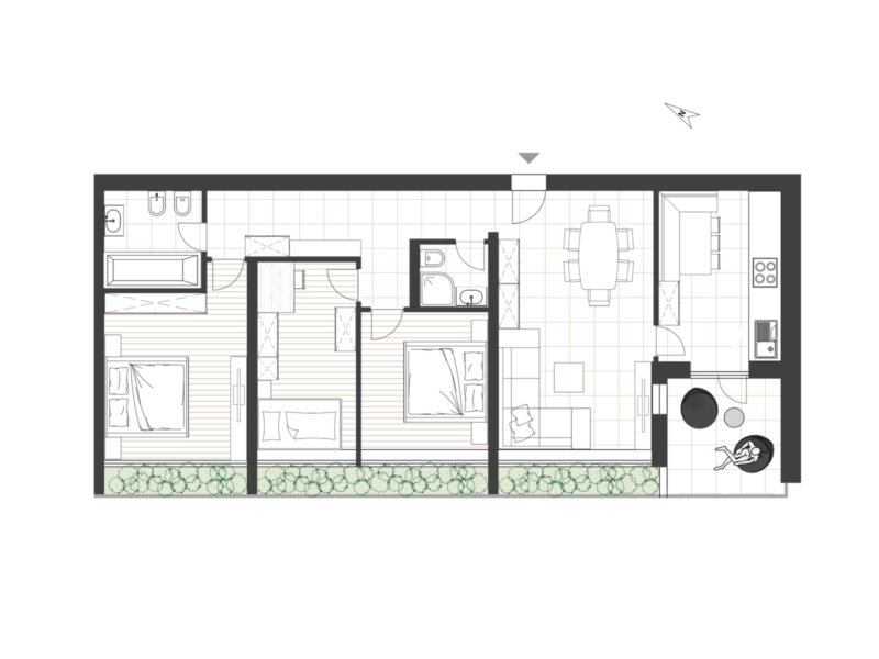 L’immobile offre un ampio e luminoso soggiorno, una cucina separata, tre camere da letto e due bagni, ideale per famiglie o per chi apprezza spazi generosi e flessibilità.
