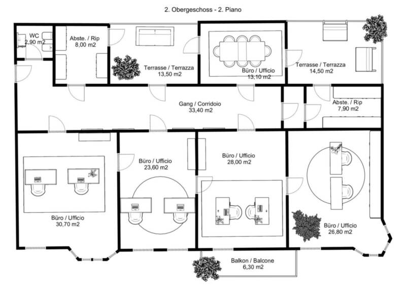 La superficie comprende cinque locali separati di diverse dimensioni, utilizzabili in modo flessibile come uffici singoli, spazi per team o sale riunioni. Le ampie finestre garantiscono unilluminazione naturale piacevole e creano unatmosfera di lavoro accogliente.