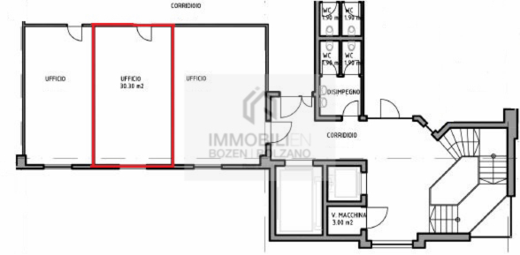 L’ufficio ha una superficie di ca. 30,30 mq e dispone di un bagno che si trova sul corridoio e che viene usato anche da altri uffici.