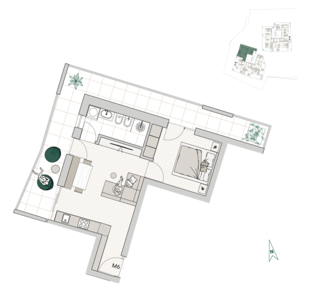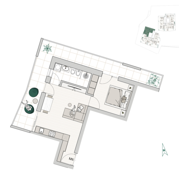 L'appartamento si trova al primo piano (Casa M) ed è composto da una cucina abitabile, una camera da letto, un bagno, una terrazza e una cantina. È possibile acquistare un box auto.