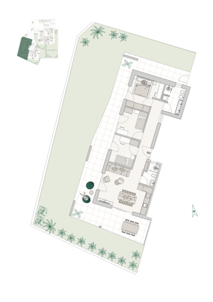 L'appartamento si trova al piano terra (Casa M) ed è composto da una spaziosa cucina abitabile, tre camere da letto, due bagni, una terrazza con un ampio giardino e una cantina. È possibile acquistare un box auto.