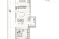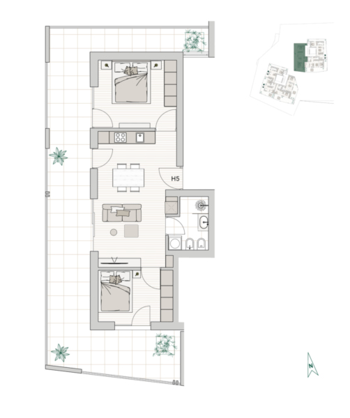 L'appartamento si trova al primo piano (Casa H) ed è composto da una cucina abitabile, due camere da letto, un bagno, una terrazza coperta e una cantina. È possibile acquistare anche un box auto.