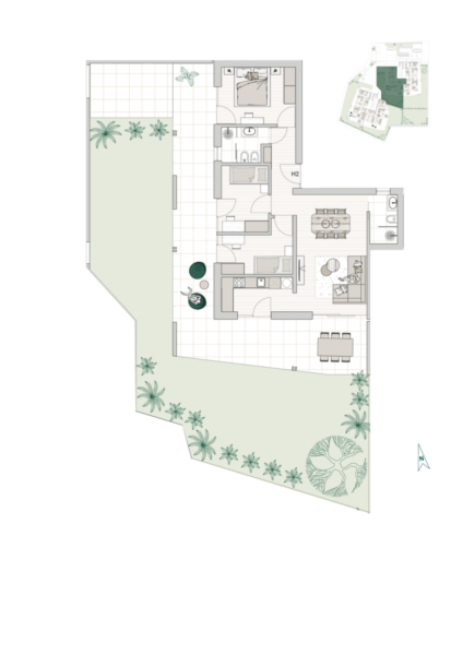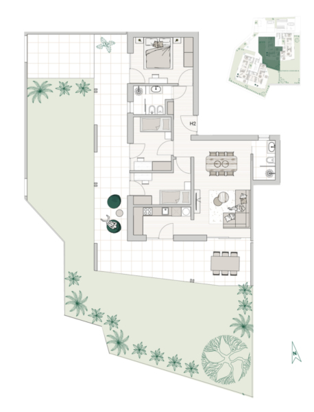 L'appartamento si trova al piano terra (Casa H) ed è composto da una spaziosa cucina abitabile, tre camere da letto, due bagni, una terrazza con un ampio giardino e una cantina. È inoltre possibile acquistare un box auto.