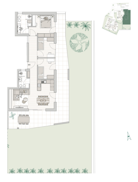 L'appartamento si trova al piano terra (Casa H) ed è composto da una spaziosa cucina abitabile, tre camere da letto, due bagni, una terrazza con un ampio giardino e una cantina. È inoltre possibile acquistare un box auto.