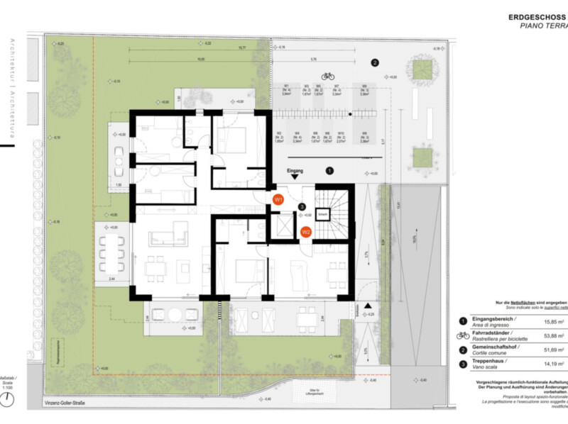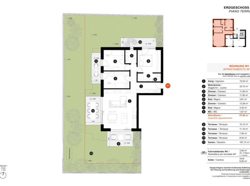 W1: L'appartamento si trova al piano terra ed è composto da: ingresso, soggiorno con cucina, 3 stanze da letto, 2 bagni, terrazza e giardino privato.