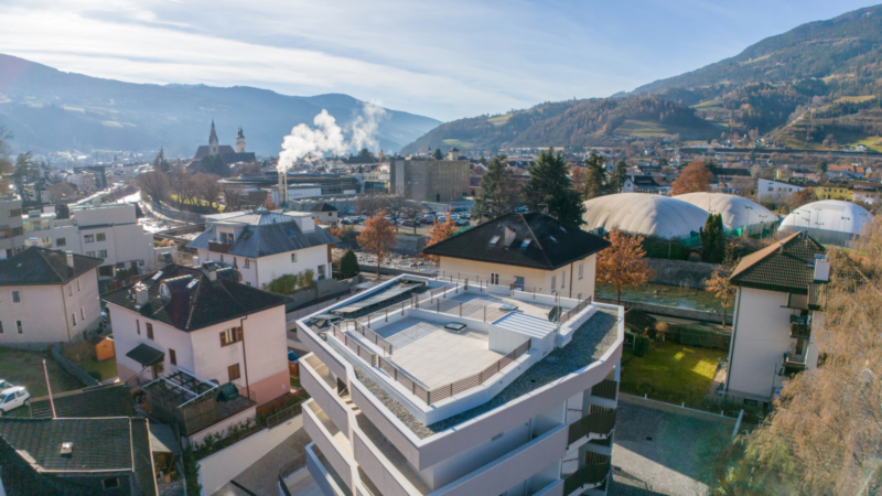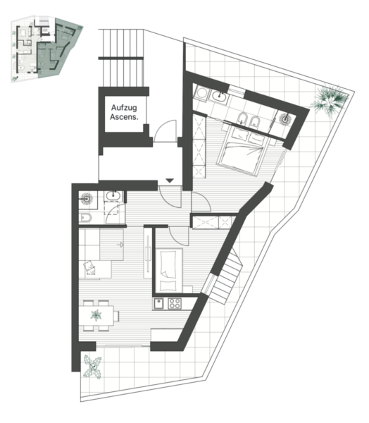 Questo nuovo trilocale dispone di una cucina abitabile, due camere da letto, due bagni e un balcone. Dal balcone si accede alla terrazza sul tetto, che offre una splendida vista sulla città. Nel seminterrato l'appartamento dispone di una cantina. È possibile acquistare separatamente un garage.