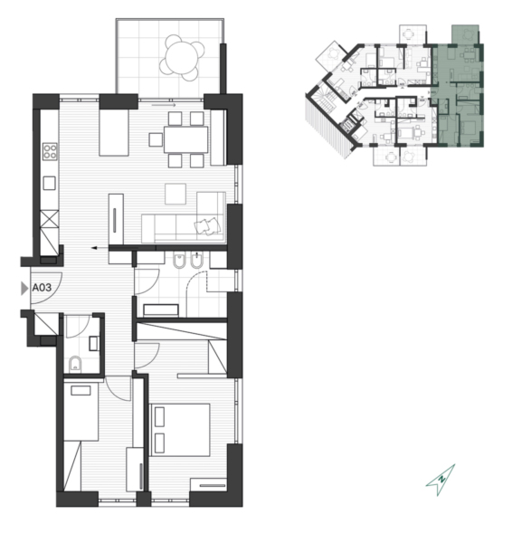 Trilocale convenzionato con cucina abitabile, due camere da letto, due bagni e balcone. Al piano interrato l'appartamento dispone di una cantina, mentre è possibile acquistare separatamente un posto auto.
