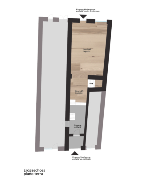 Un valore aggiunto è rappresentato dal grande magazzino al piano interrato, ideale come spazio di stoccaggio e logistica. Oltre all’ingresso principale su Via Centrale, è disponibile anche un comodo accesso dalla più tranquilla via retrostante – perfetto per carico e scarico.