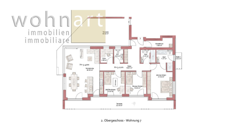 In vendita un ampio appartamento quadrilocale al 2° piano, unica abitazione su questo livello. Questo elegante appartamento si distingue per l’ampio soggiorno, tre camere da letto ben distribuite, tre bagni, uno studio e un comodo ripostiglio. Le terrazze offrono ampi spazi per il relax e invitano a trascorrere piacevoli momenti all’aria aperta. Particolarmente pratico è il grande sottotetto di circa 70 m², accessibile tramite una scala retrattile, che offre spazio aggiuntivo.
