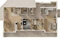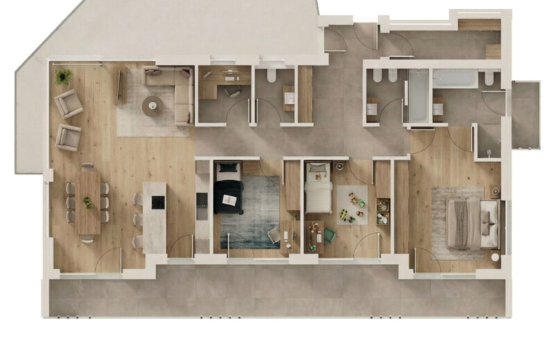 Questo attico unico offre circa 142 m² di superficie netta abitabile e convince per l’ampia zona soggiorno con cucina, tre camere da letto, uno studio, un ripostiglio, due bagni finestrati con doccia nonché un WC di servizio separato.