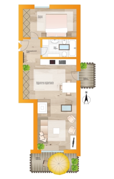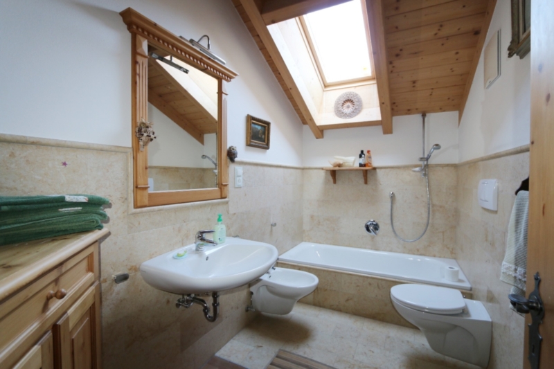 L'appartamento si trova al 1° piano e dispone di un ingresso, un bagno, una camera da letto e una zona giorno molto ampia con angolo cottura. Da sottolineare l'arredamento di alta qualità in stile tirolese e soprattutto la stufa in maiolica dipinta a mano. L'edificio residenziale non dispone di ascensore. Un posto auto e una cantina sono inclusi nel prezzo.
