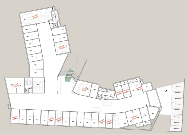 I posti auto in garage nel seminterrato possono essere acquistati separatamente come opzione (garage box: 35.000,00 euro; garage box doppio: 58.000,00 euro).