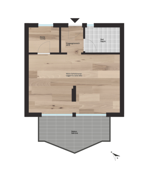 L'appartamento si trova all'ultimo piano e offre un invitante ingresso, un luminoso soggiorno/camera da letto, un pratico angolo cottura e un bagno. Il punto forte è l'ampio balcone con tanto sole e una bella vista.