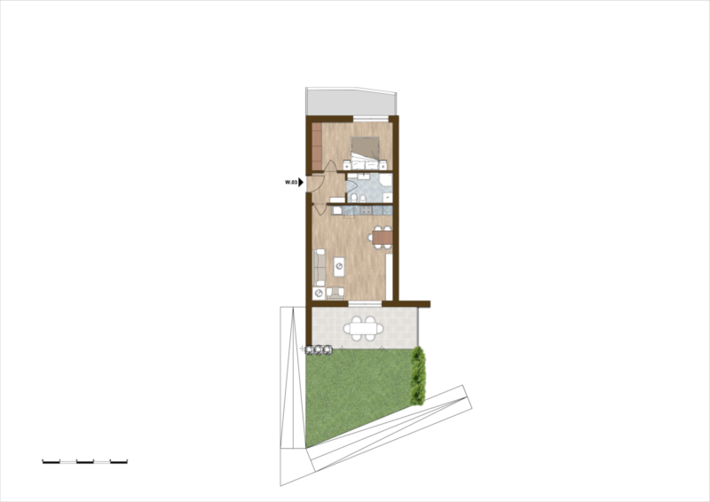L'appartmento 03 é un biocale situato al piano terra composto da: ingresso, soggiorno con cucina, camera da letto, bagno, terrazza, giardino e cantina. Dietro il pagamento di un corrispettivo l'appartamento può essere svincolato dal vincolo "alloggio per residenti".