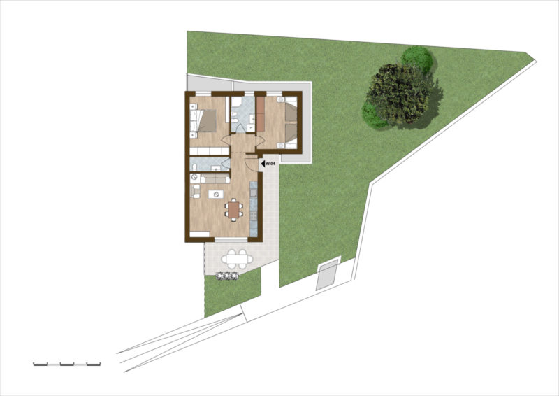 L'appartmento 04 é un trilocale situato al piano terra composto da: ingresso, soggiorno con cucina, 2 camere da letto, 2 bagni, terrazza, giardino e cantina. Dietro il pagamento di un corrispettivo l'appartamento può essere svincolato dal vincolo "alloggio per residenti".
