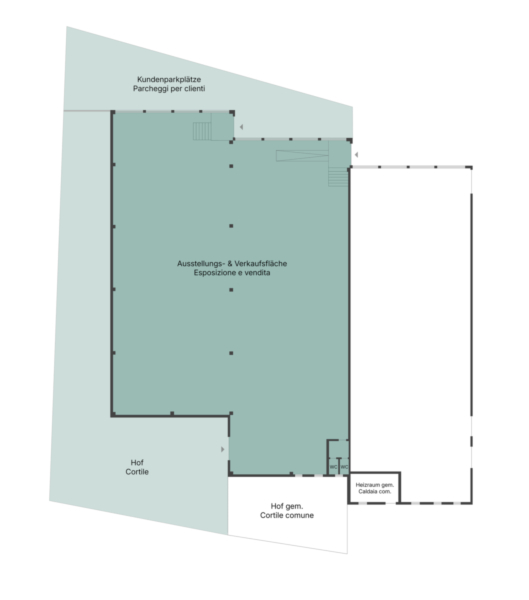All’esterno dispone di un’area pertinenziale di circa 730 m² e di una seconda area con numerosi posti auto riservati alla clientela.