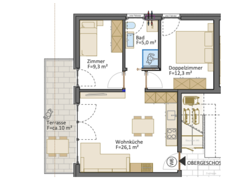 L’appartamento W6 si trova al piano primo di una moderna nuova costruzione composta da sole sei esclusive unità abitative. L’accesso avviene in modo discreto dal piano interrato, garantendo un elevato livello di privacy. Il progetto architettonico combina elementi tradizionali con linee moderne, integrandosi armoniosamente nell’ambiente circostante. L’appartamento dispone di una terrazza di circa 10 m². La distribuzione degli spazi crea un’atmosfera accogliente con un soggiorno/pranzo open space, una camera matrimoniale una camera singola e un bagno moderno. Posto auto a partire da € 22.000.