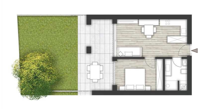 La zona giorno con soggiorno e cucina a vista offre accesso diretto alla terrazza, creando una piacevole continuità tra interno ed esterno. Anche la camera da letto è orientata verso il giardino e la terrazza, in posizione tranquilla, e rappresenta un rifugio confortevole con affaccio sul verde. Il bagno moderno si inserisce in modo funzionale ed elegante nel concept complessivo dell’abitazione.