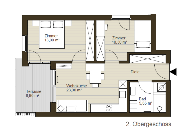 La zona giorno, progettata in modo aperto, offre accesso diretto alla terrazza, creando un ambiente luminoso e accogliente. L’unità dispone di due camere da letto, di cui una con accesso diretto alla terrazza, ideale come spazio di riposo riservato. Il bagno è concepito in modo pratico e senza tempo.