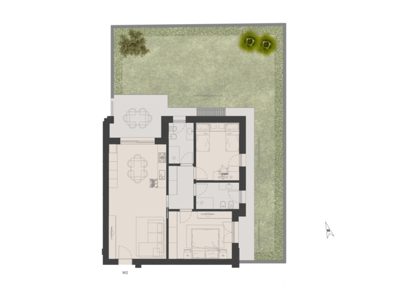 Il trilocale, con ampio giardino e terrazza ideale per pranzi e relax, dispone di un ampio soggiorno con cucina a vista tipo open-space.